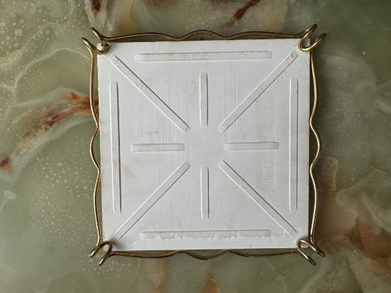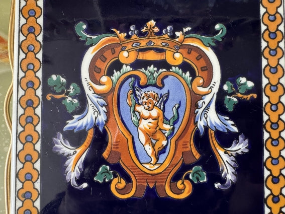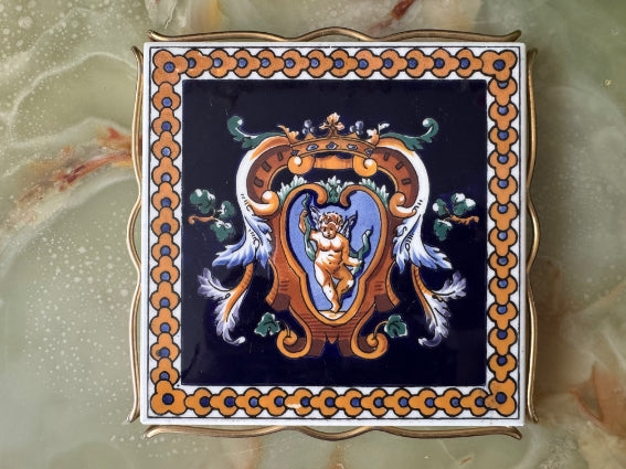 Attractive Gien earthenware trivet featuring the famous Renaissance design on a blue background.