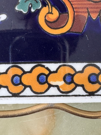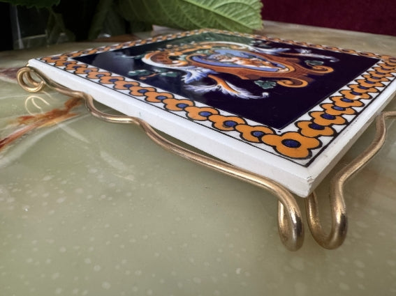 Nice Gien earthenware trivet with the famous Renaissance design on a blue background and metal stand.