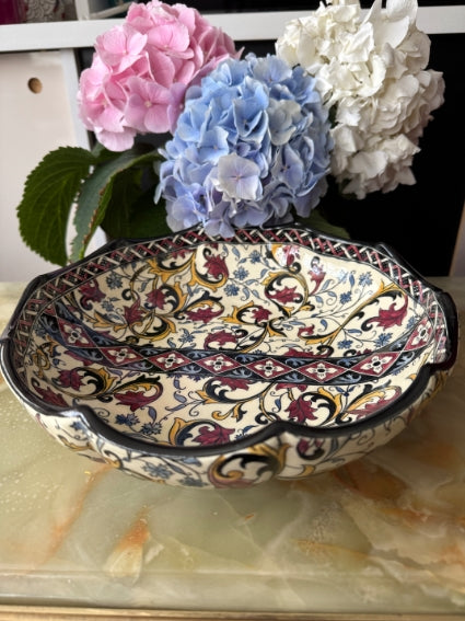 Pretty "melonnière" dish in Gien earthenware, "Moyen Age" pattern.In good condition. No cracks or chips.The signature on the back dates the piece between 1938 and 1960.