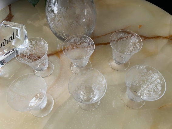 Charmant service à porto/liqueur composé d'une carafe avec son bouchon et 6 verres. Le modèle Elisabeth Millefiori date des années 30 et se distingue par son décor de fleurs d'edelweiss gravé à l'acide. Le décor est inspiré par un tableau de 1865 de Franz Xaver Winterhalter, représentant la célèbre impératrice Elisabeth d'Autriche (Sissi), des edelweiss dans les cheveux.