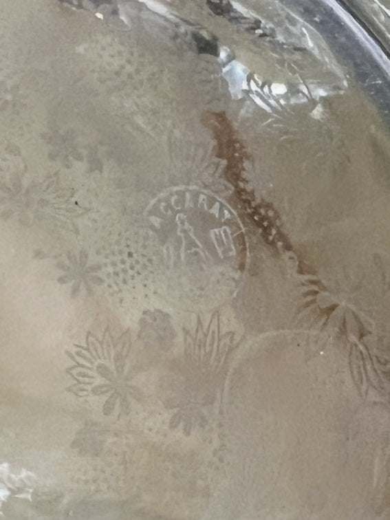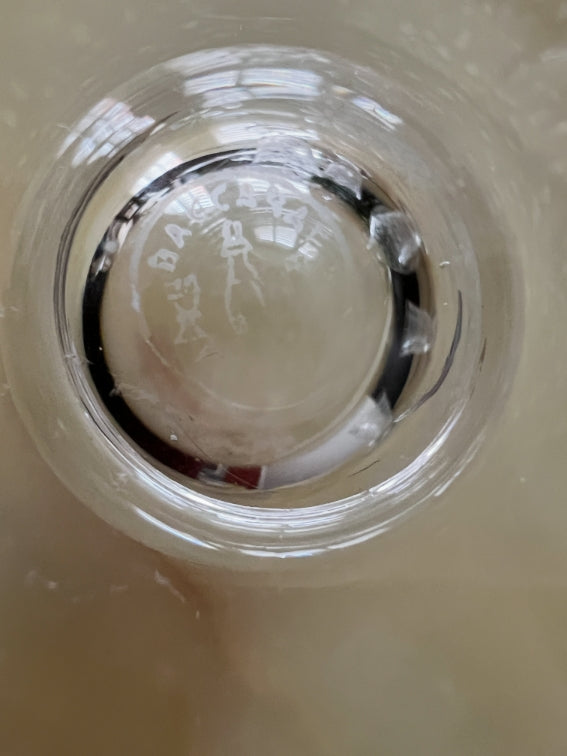 Les verres sont estampillés, sauf un, ainsi que la carafe. L'un des verres présente une micro-égrénure au niveau du buvant, impossible à photographier car très discrète.